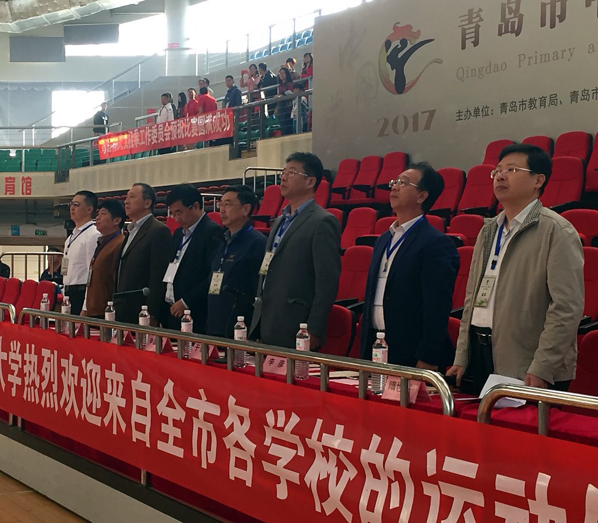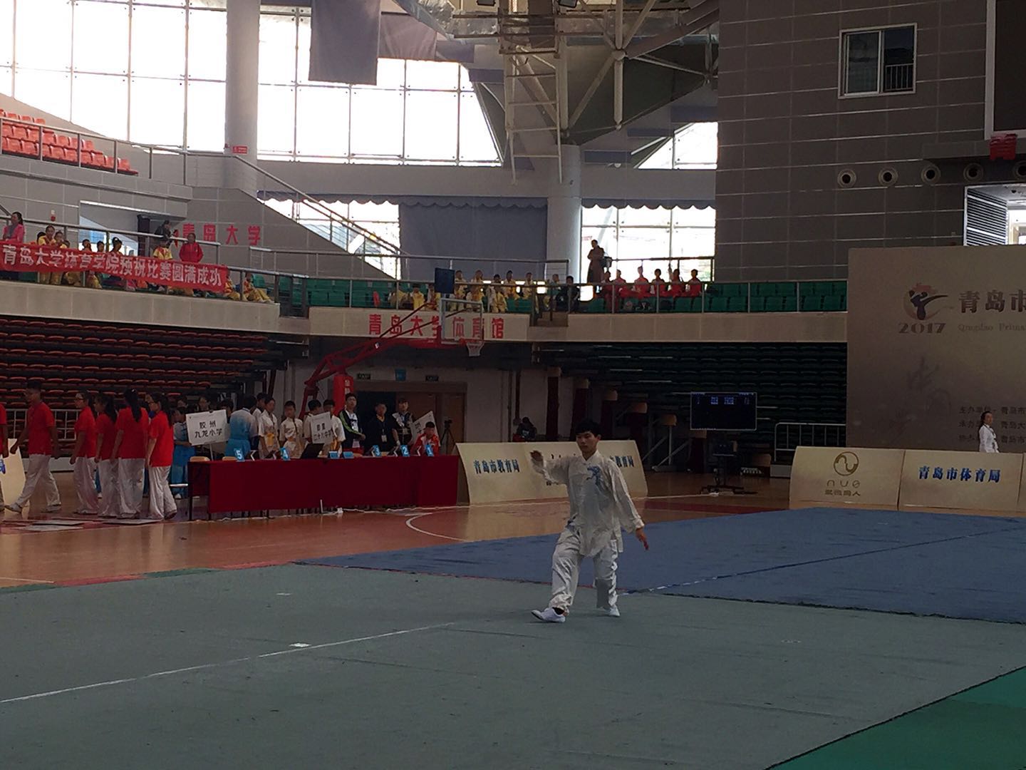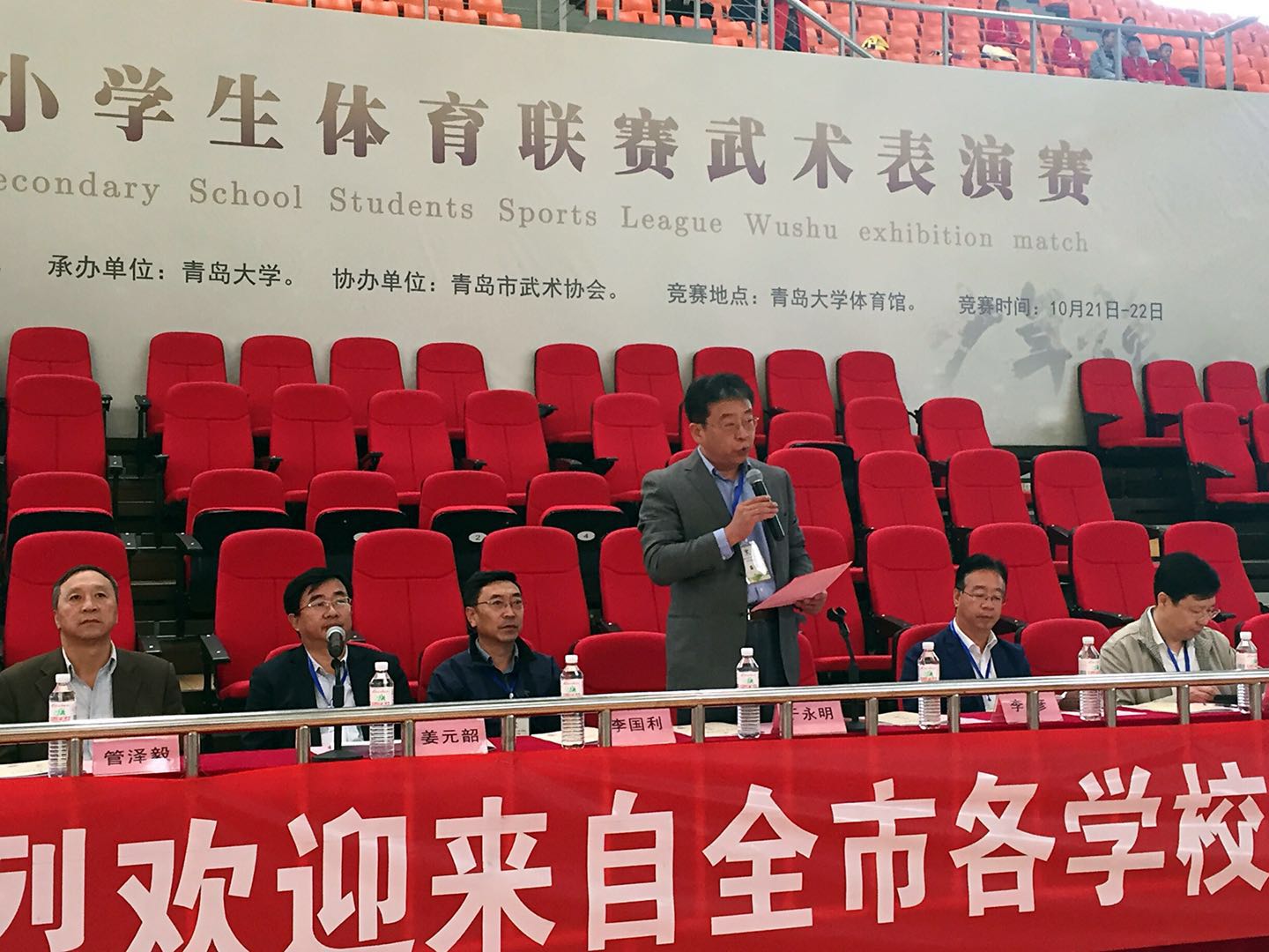 10月21日8:30,由青岛市教育局、体育局主办,beat365亚洲体育官方网站承办的青岛市中小学生体育联赛武术表演赛在beat365亚洲体育官方网站浮山校区体育馆隆重举行,来自全市各中小学29支参赛队的455名参赛选手参加本次比赛。beat365亚洲体育官方网站党委常委、副校长于永明进行赛前讲话,青岛市教育局副局长姜元韶、青岛市体育局副局长赵秀云、青岛市教育局体卫艺处处长李彦、青岛市体育局训竞处处长刘新宏、青岛市体育总会秘书长刘强、beat365亚洲体育官方网站院长管泽毅出席了开幕式,青岛市体育总会专职副主席、武术协会会长李国利宣布比赛正式开始。