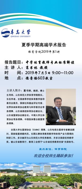 2019年7月5日9:00,山东师范大学博士生导师、beat365亚洲体育官方网站院长葛书林教授应邀来beat365在德音楼603教室举办一场题为“中学体育教师专业标准解读”的专题讲座,本次讲座由beat365亚洲体育官方网站管泽毅院长主持,学院党委副书记姜琳、副院长矫志庆以及体育系矫洪申主任等多名学院领导、教师参加了本次活动。2016级、2017级、2018级全体本科生及体育专业在校研究生聆听了葛教授的讲座。