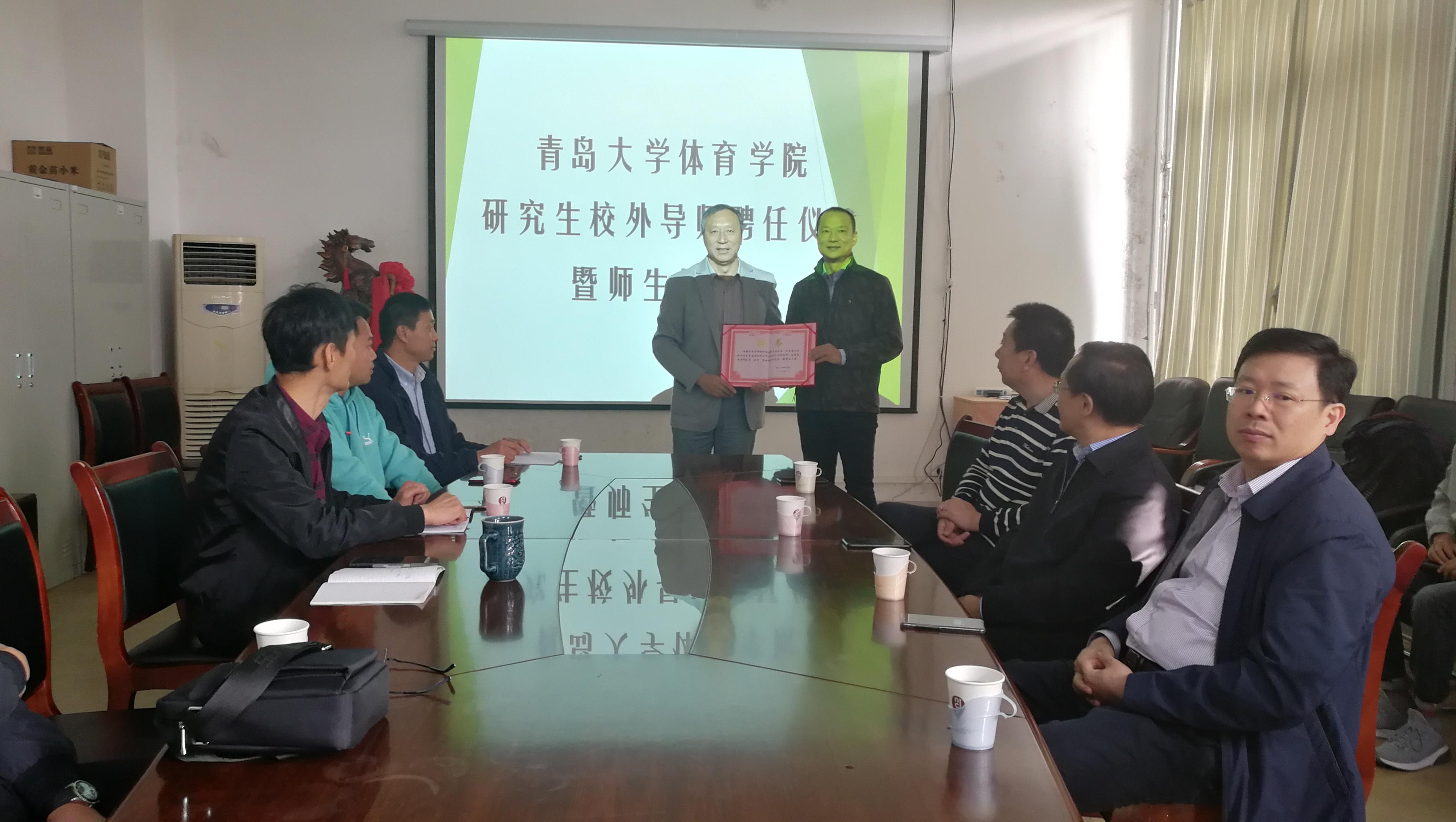 首先进行了校外导师受聘仪式,由管泽毅院长为新加盟的青岛市教育科学研究院孙金宝颁发聘书,新聘为beat365亚洲体育官方网站体育教育专业硕士研究生校外导师。
