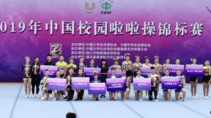 由中国大学生体协主办的“2019年中国校园啦啦操锦标赛”12月22日在海南省澄迈县体育馆圆满结束,共有来自全国54支队伍,1000多人运动员参加了比赛,比赛设有舞蹈啦啦操(花球、爵士、街舞)、技巧啦啦操等项目。