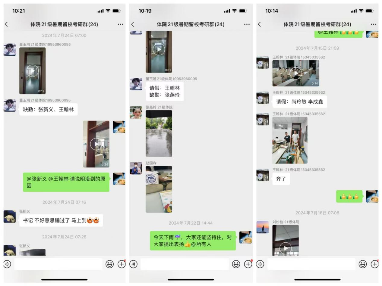 2、“六次视频打卡”,锻造自律铁律:假期期间,学院针对学生特点,结合学生实际需求,采取严格有效的管理举措。所有假期留校或居家备考的学生,需加入学院指定的考研互助监督打卡群,学生严格按照规定的时间节点每天从早到晚进行六次学习情况视频监督打卡,视频内容需清晰显示学生本人及所处的学习环境、打卡时间、打卡地点,以证明其处于真实学习状态。